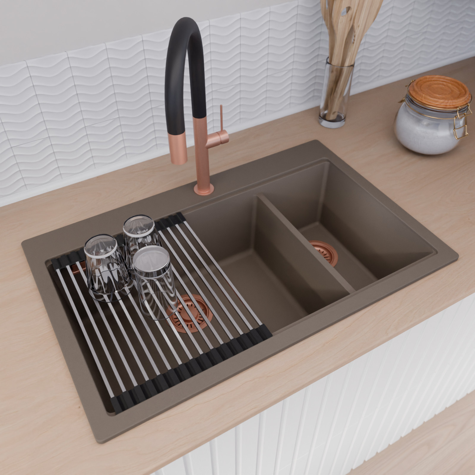 HD Aspen Tortora 78 Kétmedencés mosogatótálca szett, vágódeszkával, csepegtetőráccsal és kosárral, tortora