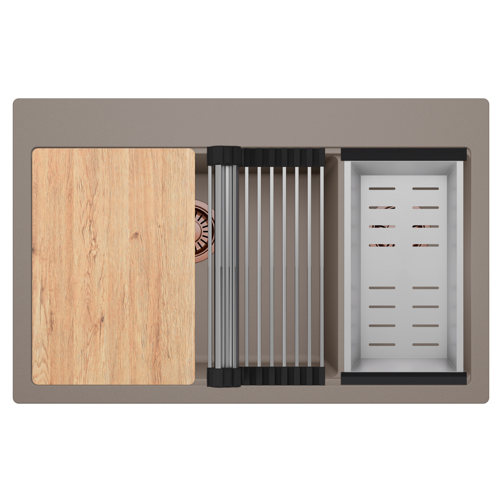 HD Aspen Tortora 78 Kétmedencés mosogatótálca szett, vágódeszkával, csepegtetőráccsal és kosárral, tortora