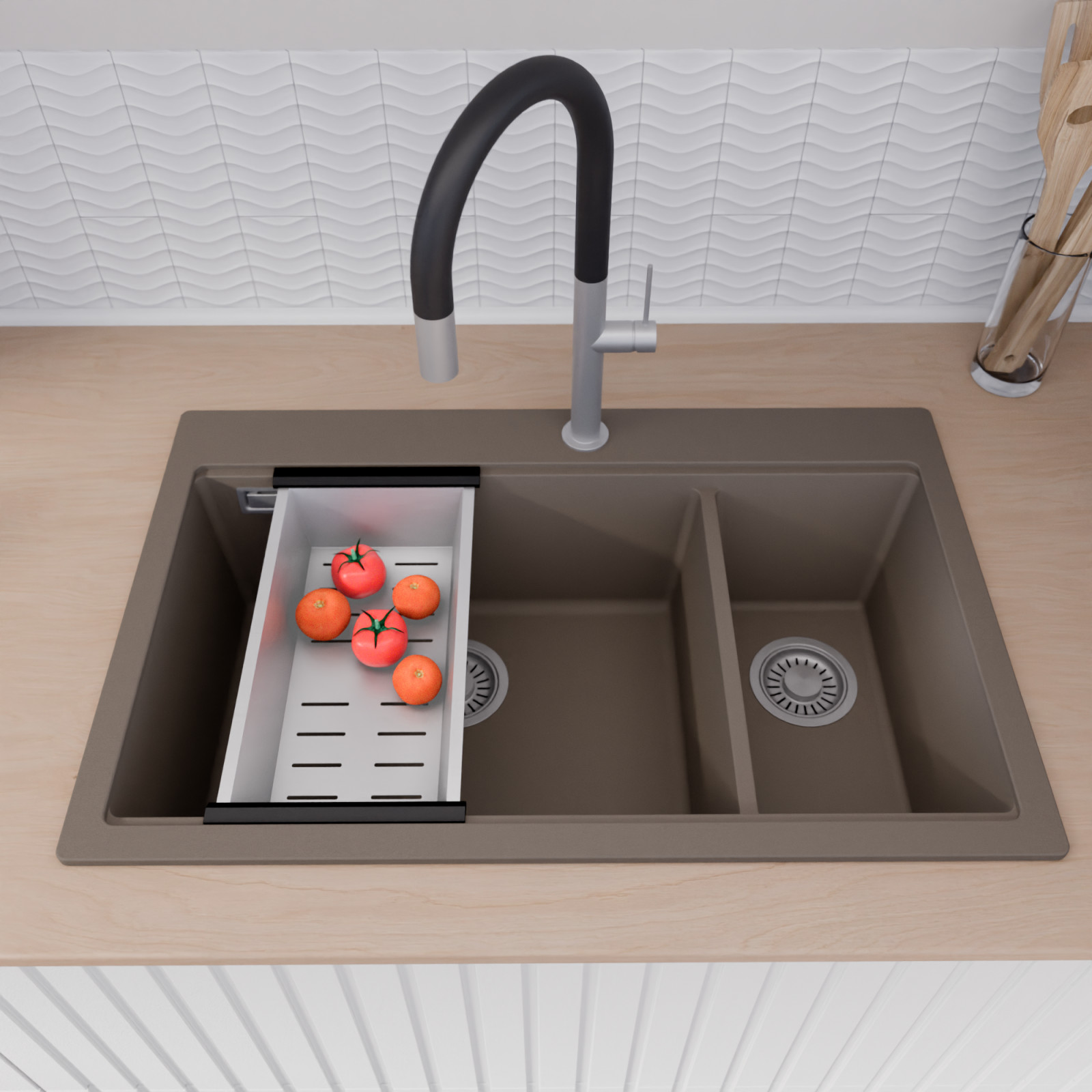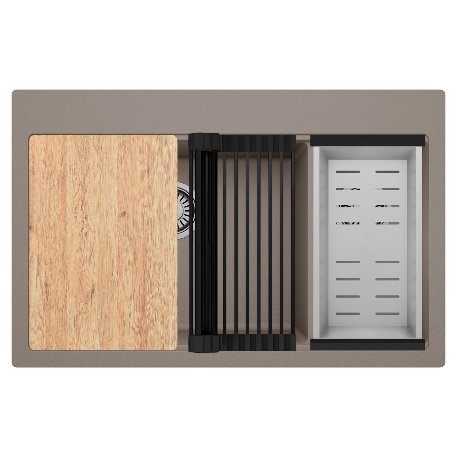 HD Aspen Tortora 78 Kétmedencés mosogatótálca szett, vágódeszkával, csepegtetőráccsal és kosárral, tortora