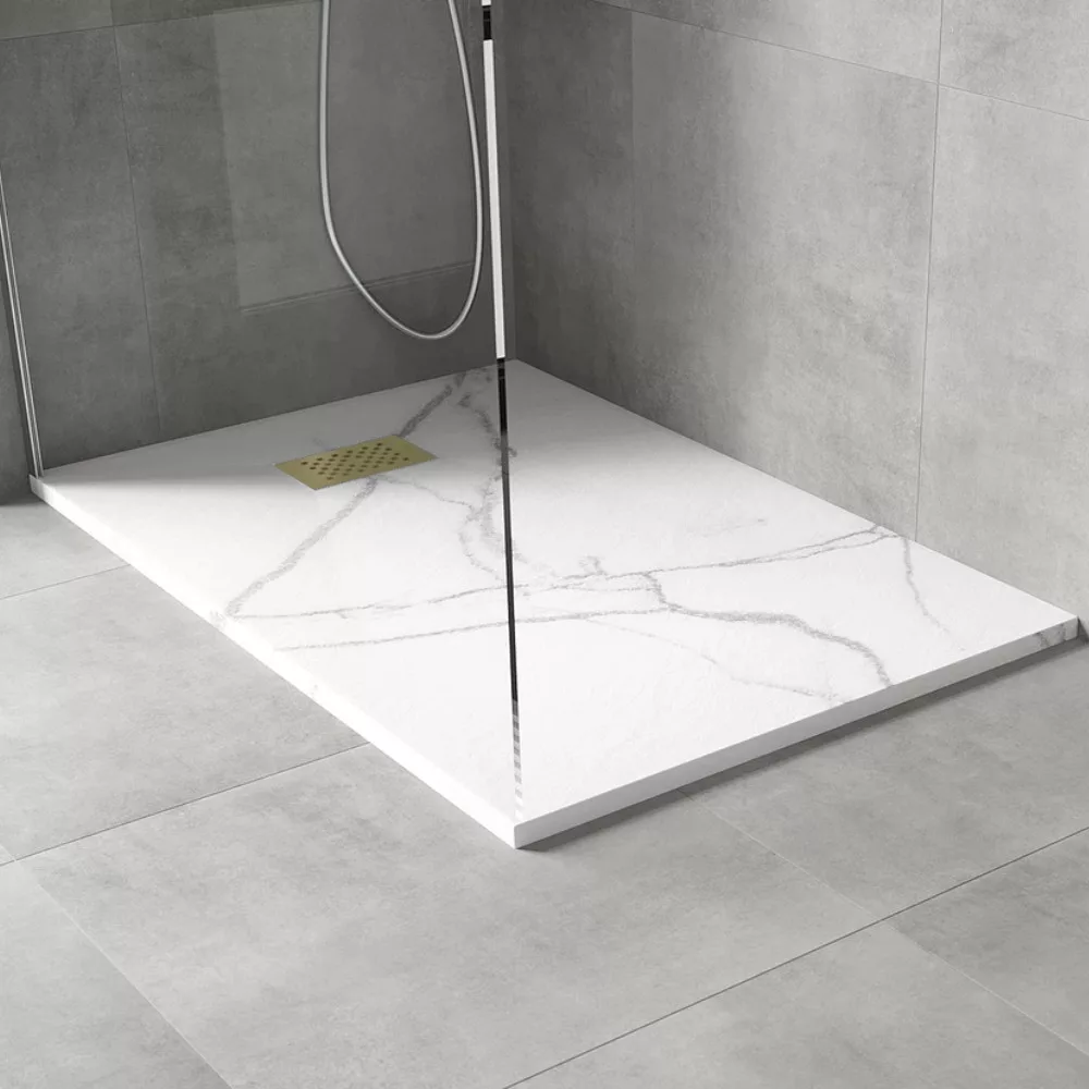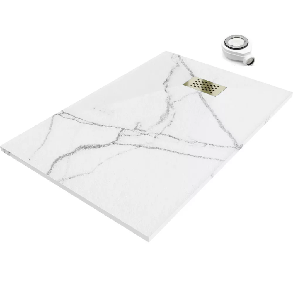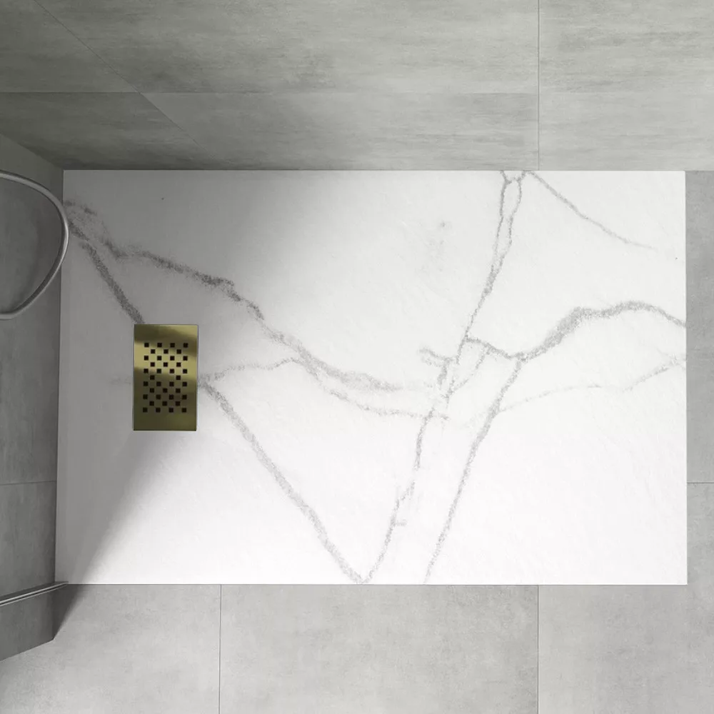 HD Marco White Marble 100x80 szögletes SMC zuhanytálca arany színű zuhanylefolyó ráccsal