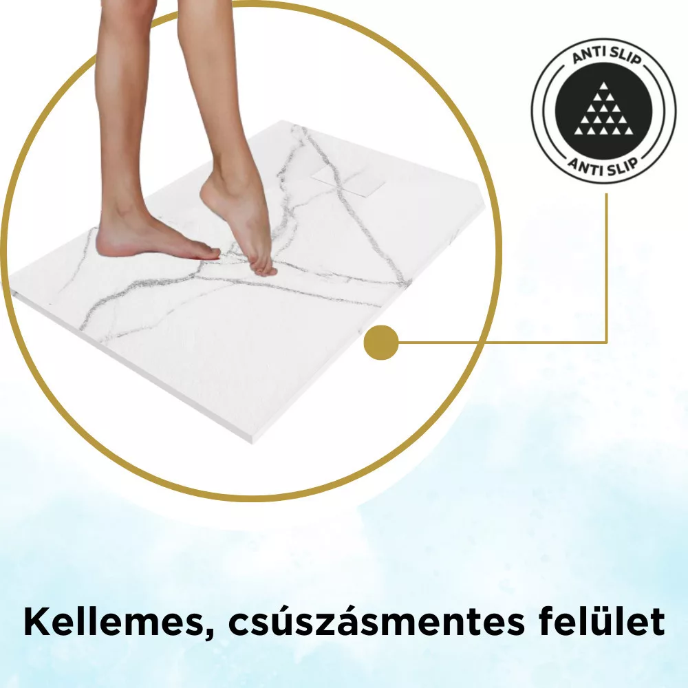 Az SMC kompozit zuhanytálca csúszásmentes felülettel rendelkezik, amely hatékonyan csökkenti a zuhanyzás közbeni elcsúszás kockázatát, növelve az Ön és családja biztonságát. A hagyományos zuhanytálcákkal összevetve magasabb biztonságot és stabilitást ad a HD Marco SMC kompozit zuhanytálca.