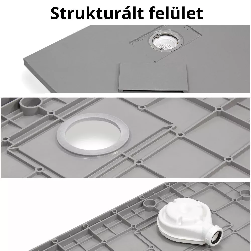 - Tartozékok: SMC kőhatású zuhanytálca, krómozott zuhanylefolyó rács, színazonos kőhatású SMC lefolyó takarófedél, vágható előlap, lábszett