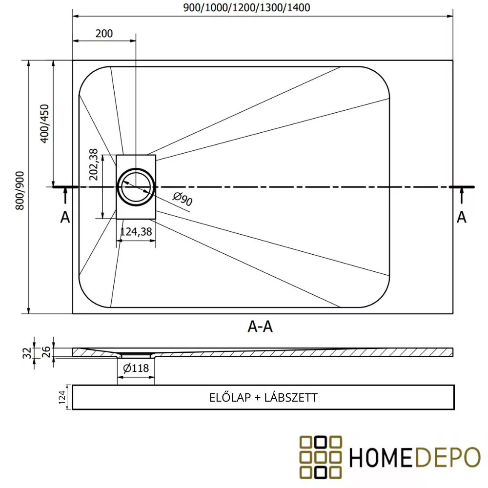 - Tartozékok: SMC kőhatású zuhanytálca, színazonos kőhatású SMC lefolyó takarófedél, zuhanytálca szifon, vágható előlap, lábszett