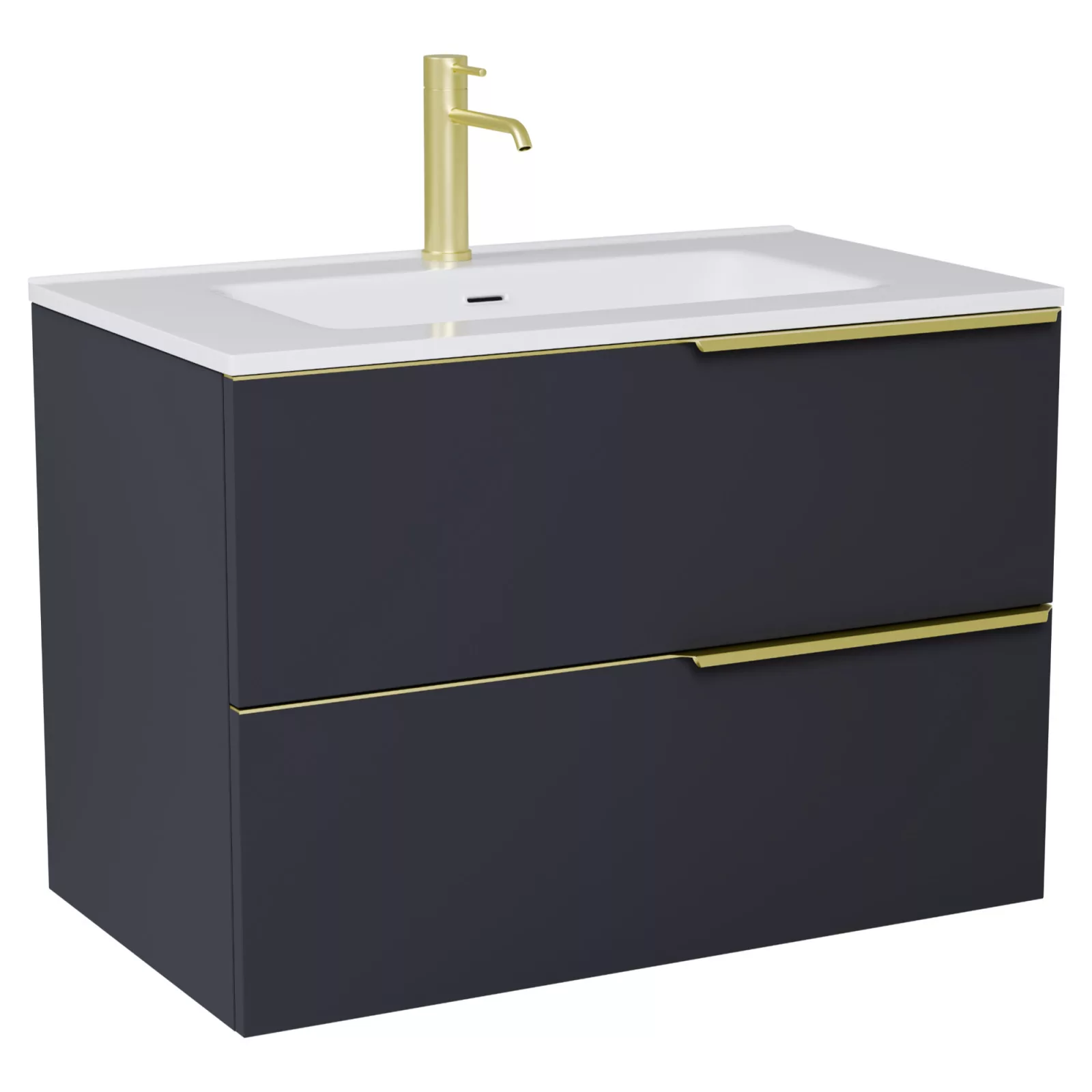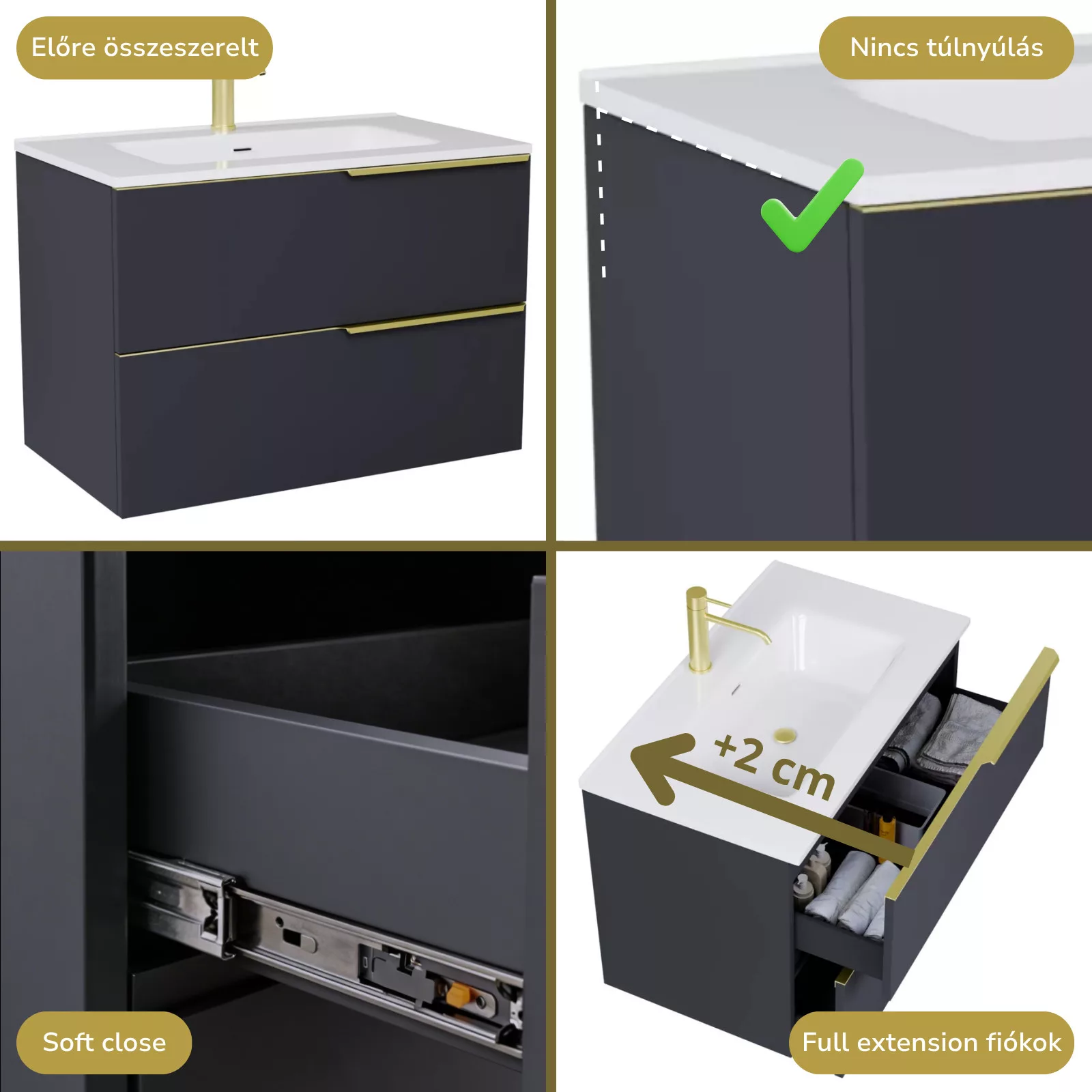 HD Cremona Matt Antracit 60 fali mosdószekrény szálcsiszolt arany fogantyúkkal és fényes fehér slim mosdóval