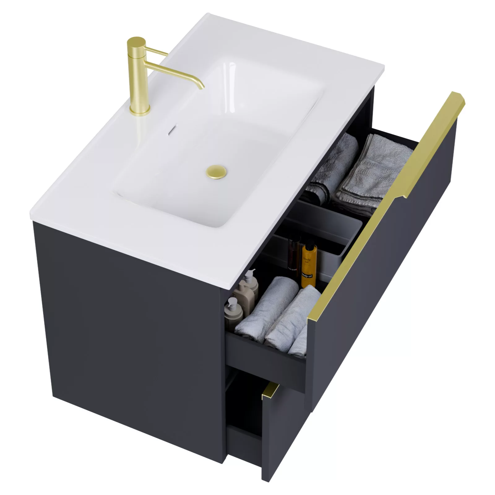 Saját márkás 60 cm széles fali mosdószekrény matt antracit színben, szálcsiszolt arany fogantyúkkal, fényes fehér slim mosdóval, rejtett fióksínnel és önbehúzos technológiával ellátott.