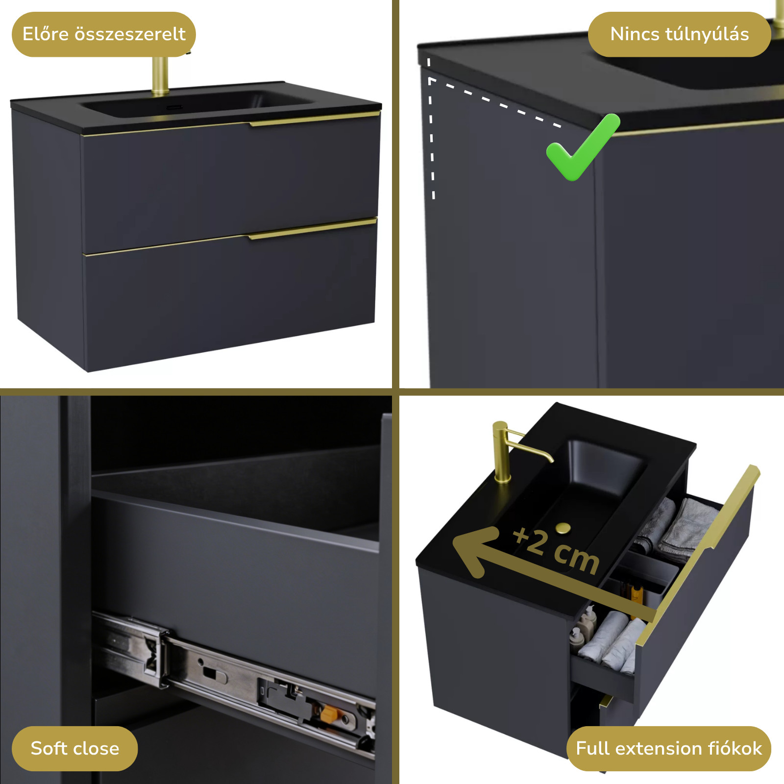 Saját márkás 60 cm széles fali mosdószekrény matt antracit színben, szálcsiszolt arany fogantyúkkal, fekete slim mosdóval, rejtett fióksínnel és önbehúzos technológiával ellátott.