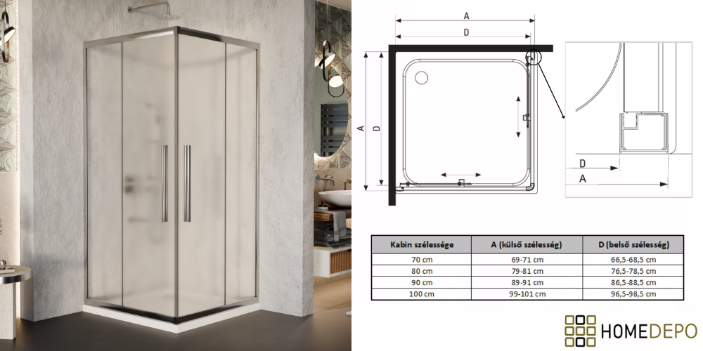 Napjainkban a praktikum mellett a fürdőszoba esztétikus megjelenése is fontos szempont. Az átlátszó üveges zuhanykabinok egyik előnye, hogy nem szűkitik össze a teret, elegáns, légies megjelenést kölcsönöznek a fürdőszobának. Az átlátszó üvegű zuhanykabinok a hagyományos és modern fürdőszobákban is megállják a helyüket. Az tolóajtónál az ajtónyílásból elvesznek az egymásra csúszó részek. Kisebb helyiségekben is kiváló megoldás lehet helytakarékosság szempontjából, mivel így nem kell arra figyeljen, hogy legyen elég hely az ajtó kinyitásához. A szögletes formával a rendelkezésre álló teret maximálisan ki lehet használni. Előnye, hogy zuhanyzáskor kényelmes, az íves formánál jelentősen nagyobb tér áll rendelkezésre. Saját márkás, Homedepo Elio, szögletes zuhanykabinunk, dupla görgőkkel érhető el, aminek köszönhetően jobban eloszlik a terhelés, egy ajtó 2 pont helyett 4 ponton gördül. Ez nagy mértékben biztosítja az egyenletesebb, simább működést és a hosszabb élettartamot. A görgők további fontos tulajdonságai közé sorolható, hogy Quick release systemmel ellátottak, aminek segítségével könnyedén fel- és leszerelhető a könnyedebb tisztítás érdekében.